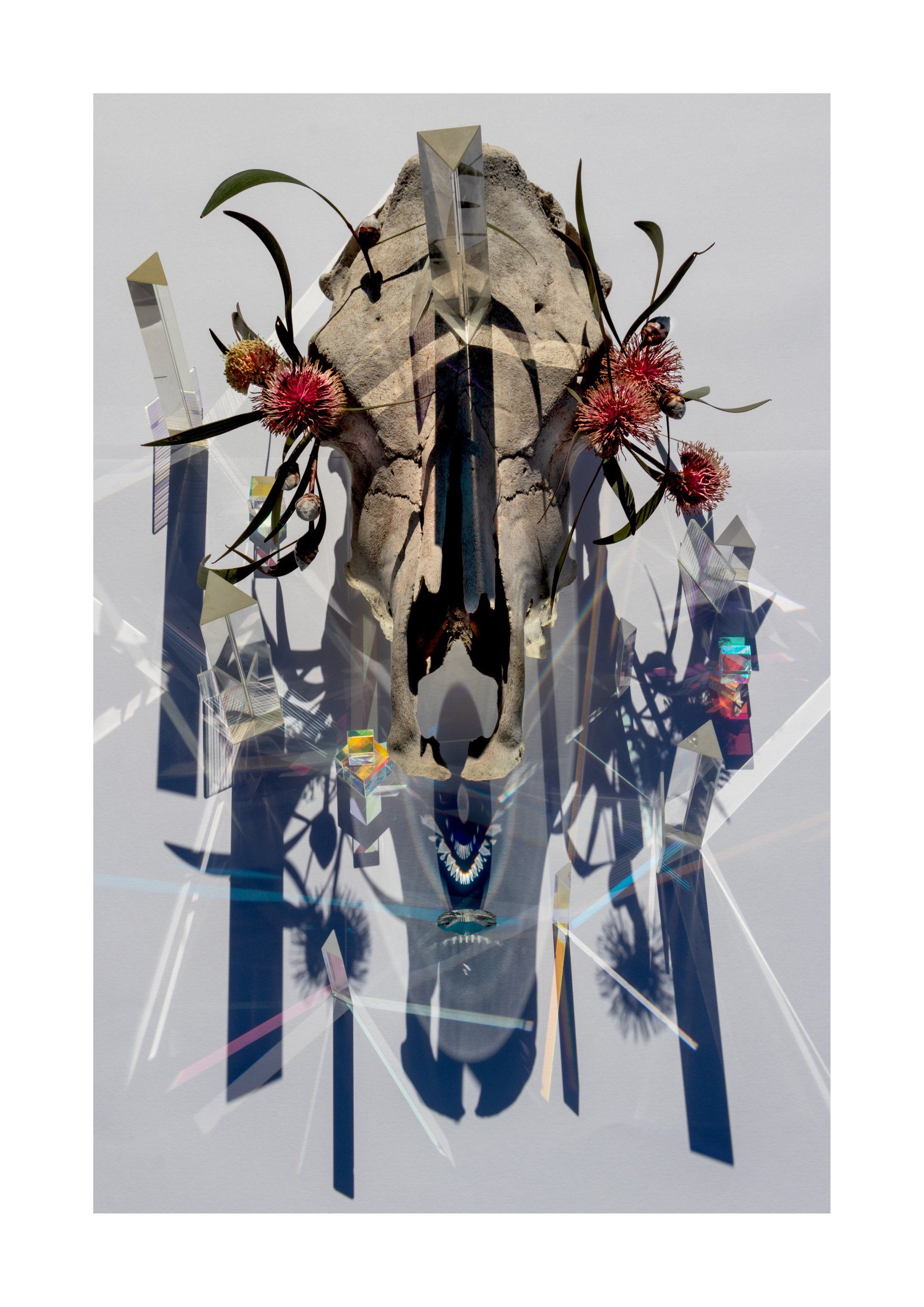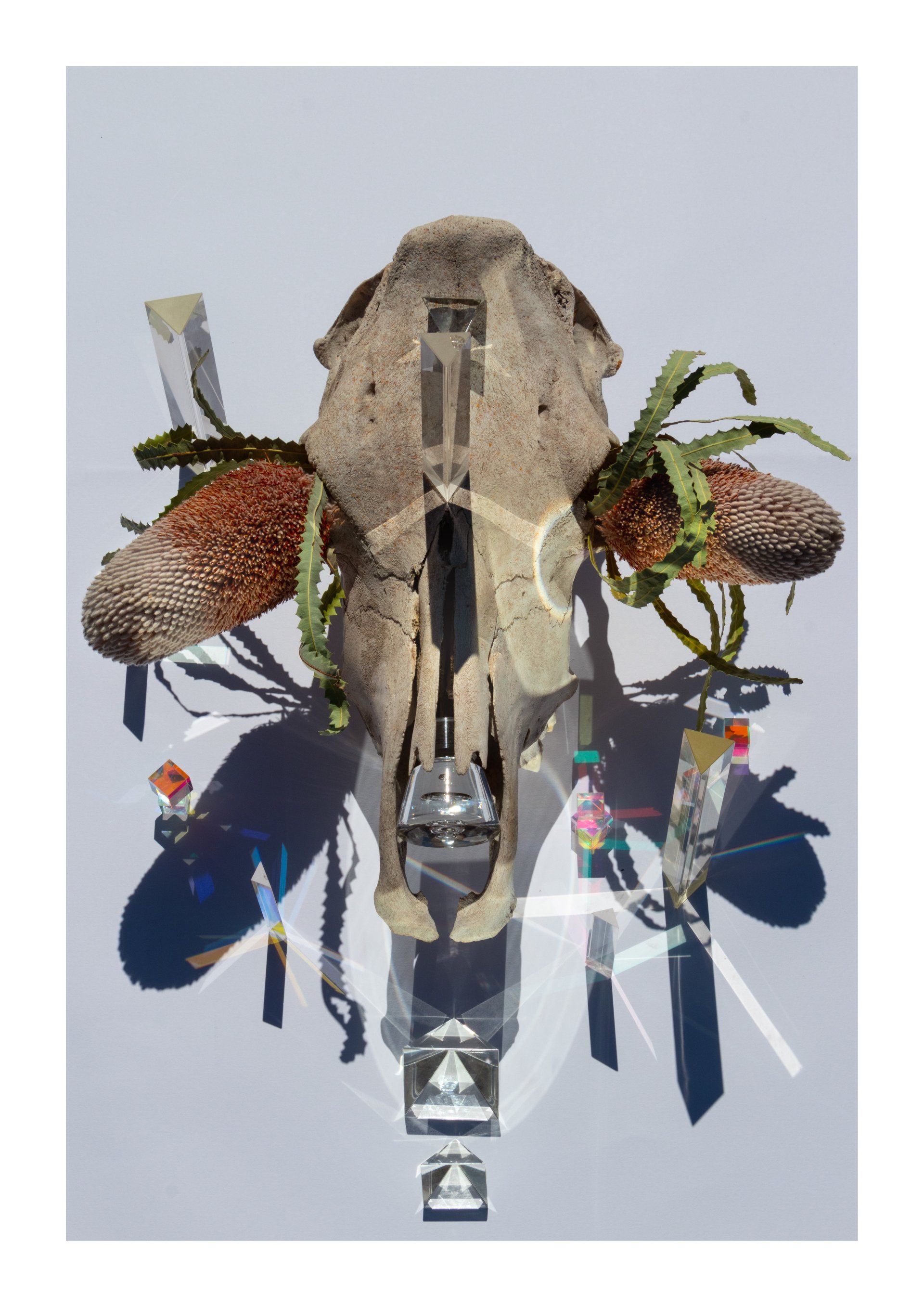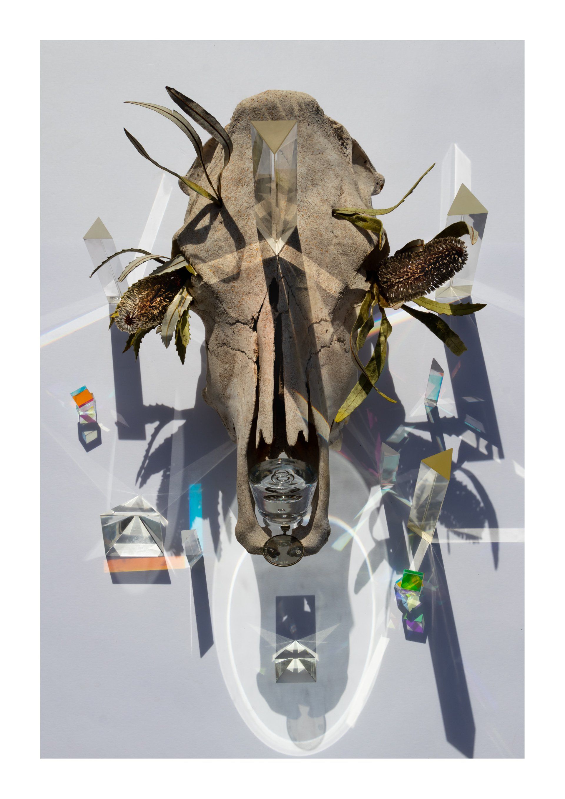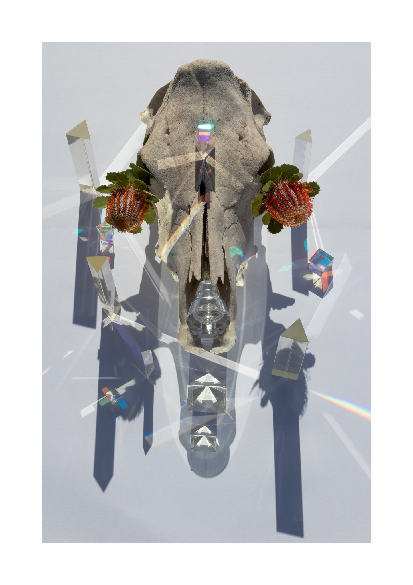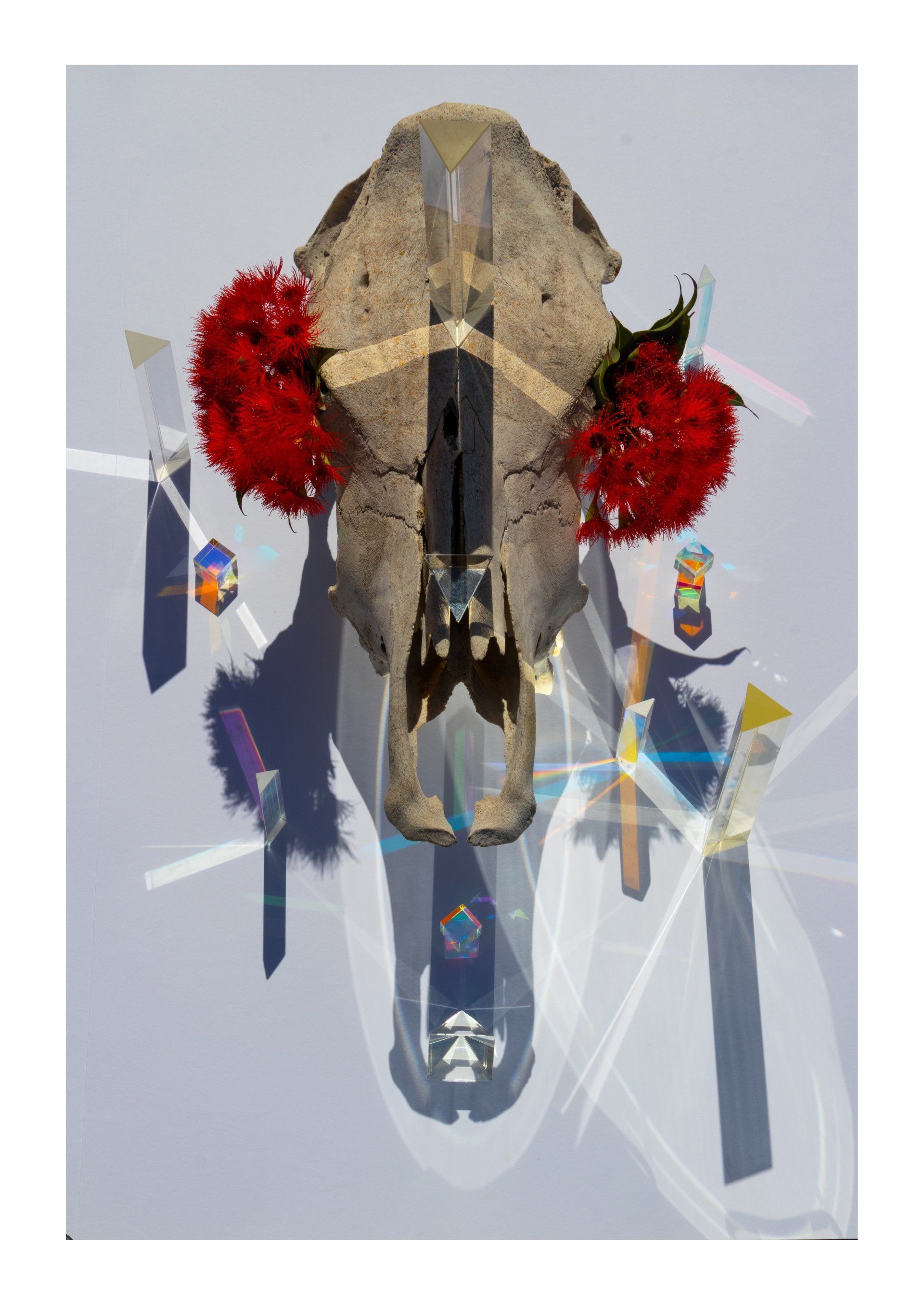 Using a variety native Australian fauna, glass prisms, cows’ skull, mirrors and the sun, the artist has created multi-faceted light spectrum's that transmute the dark shadows and reignite life back into otherwise dead or disused objects. In this series he explores the beauty and variety of some of Australia's native flowers to bring life back into and reimagine a cow’s skull.