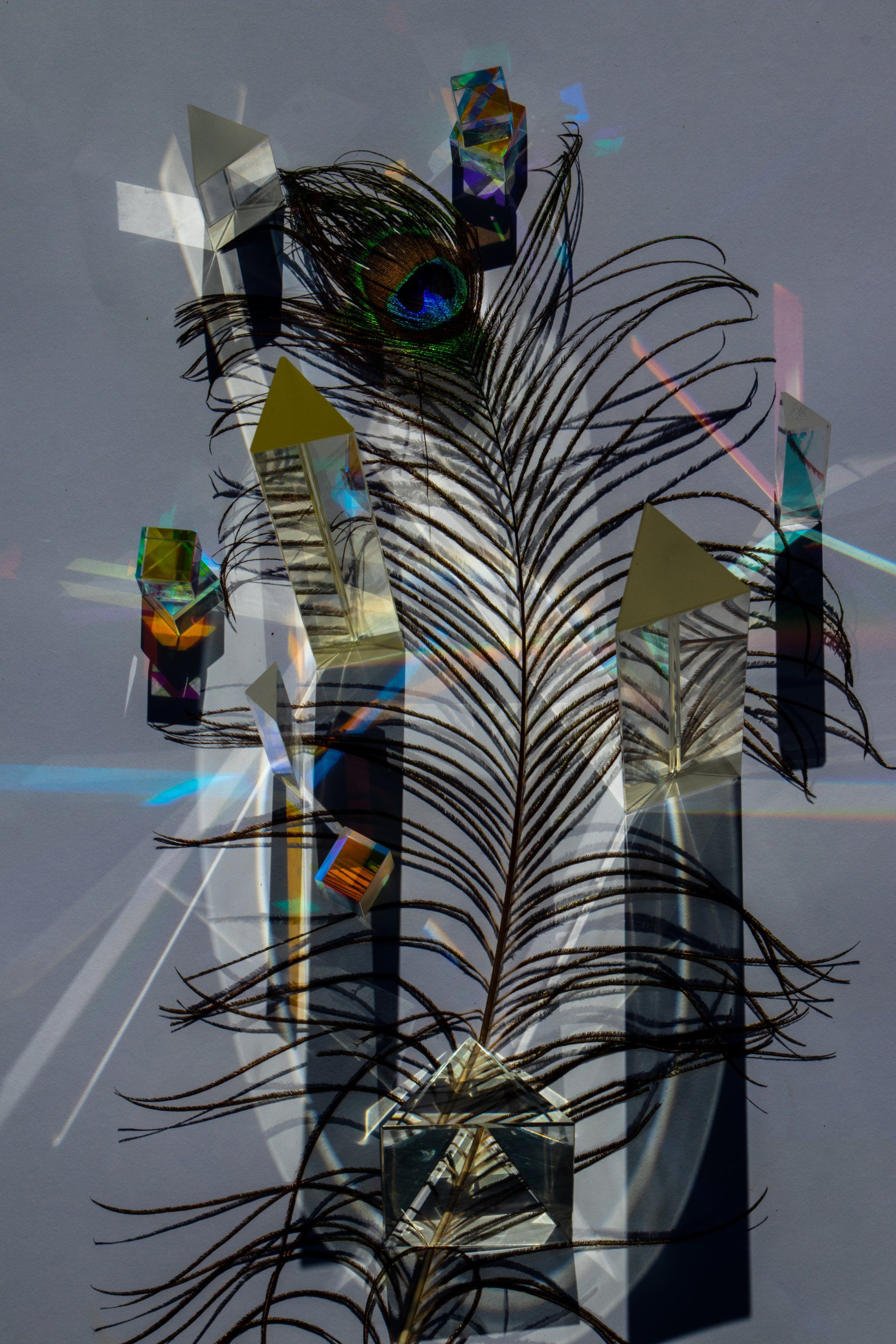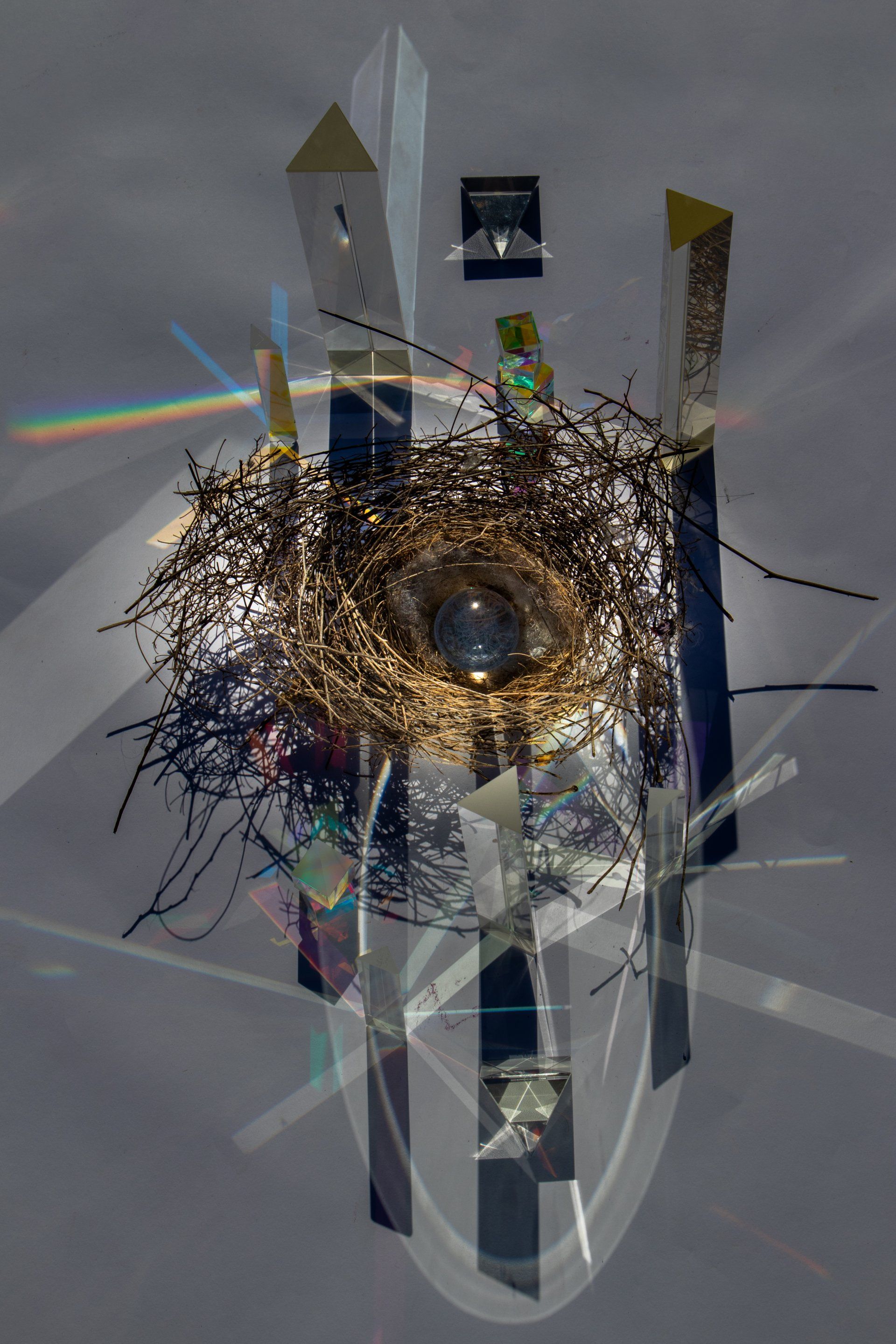 Using a variety of glass prisms, found objects, mirrors and the sun the artist has created multi-faceted light spectrum's that transmute the dark shadows and reignite life back into otherwise dead or disused objects. This is reflected in the underlying hOPE and new beginnings that are emerging across the planet under these extremely trying times we currently live in.